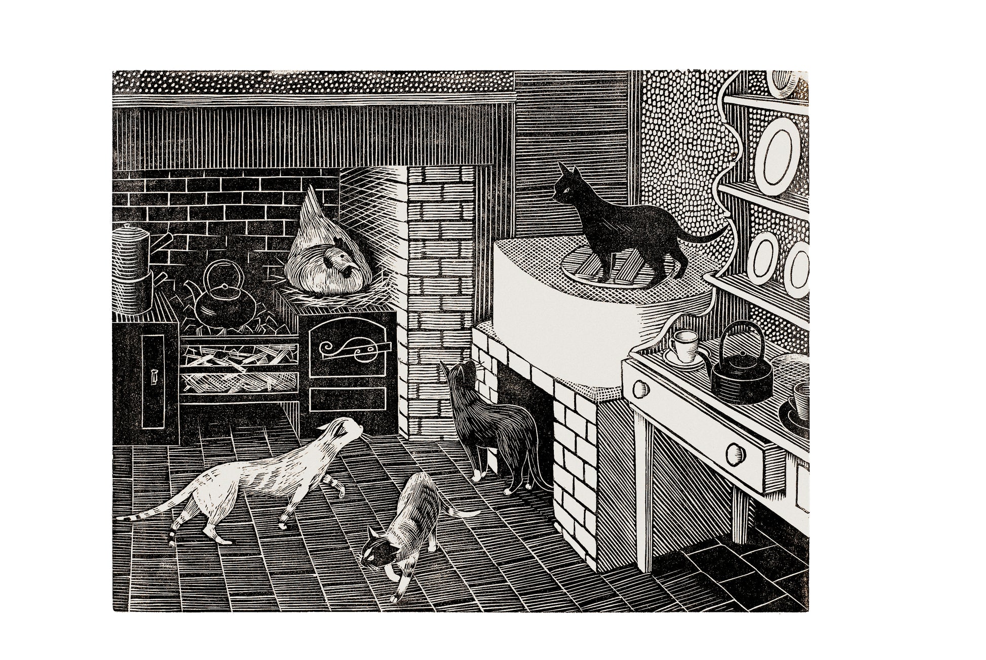 The Cats Mug is a part of Brick House Design's ceramics collection based on the designs of Tirzah Garwood. The Design is a detail taken from a woodcut created by Tirzah in 1929 called "Brick House Kitchen". An image pf that woodcut can be seen alongside the product pictures.