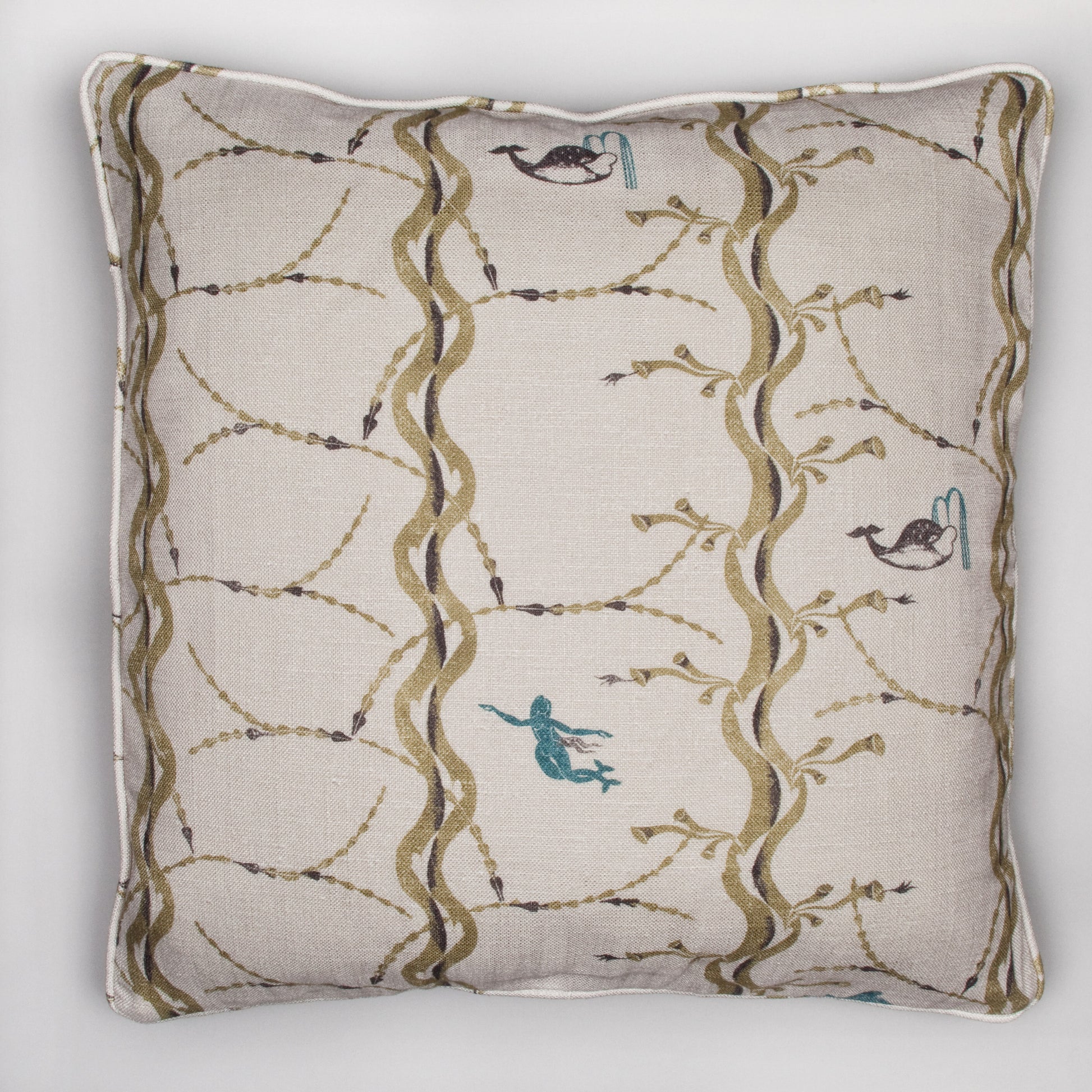 Brick House Design Mermaid and Whale print cushions are available in linen, cotton and velvet. Linen is pictured.