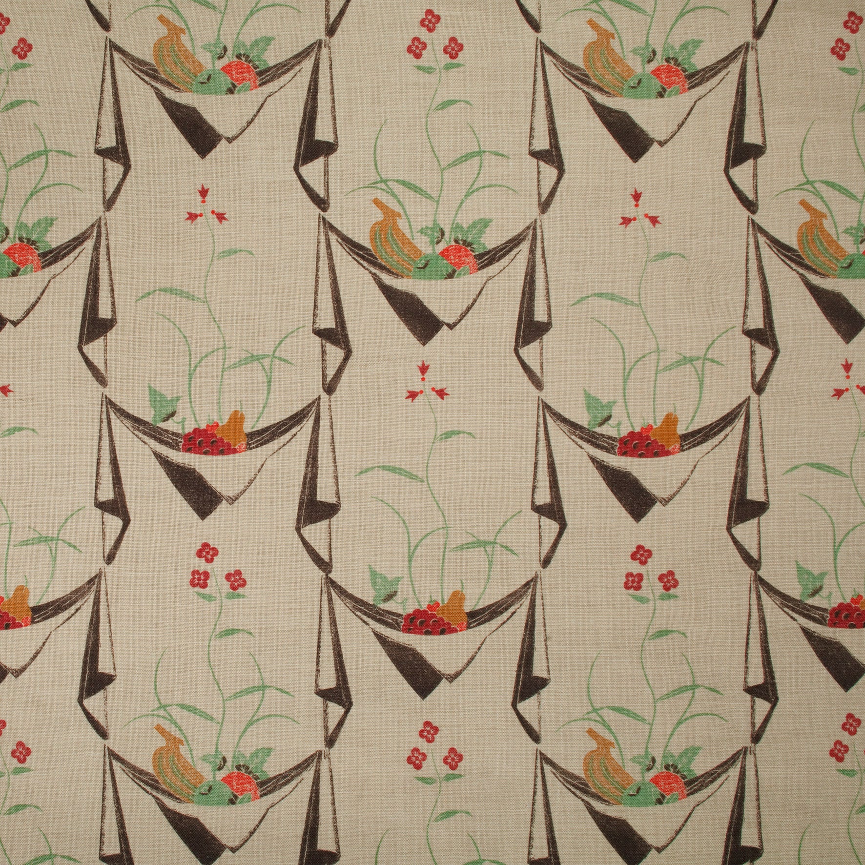 From an original design by Edward Bawden, Napkin/Fruit print fabric is available to order from Brick House Design. The fabric is available in its original colouration as well as a small selection of sensitively created new colourways. In addition the print is available on a variety of bases from Linen, to Cotton and Velvet
